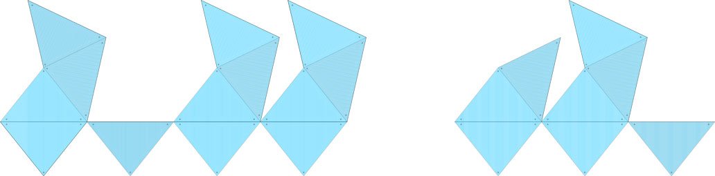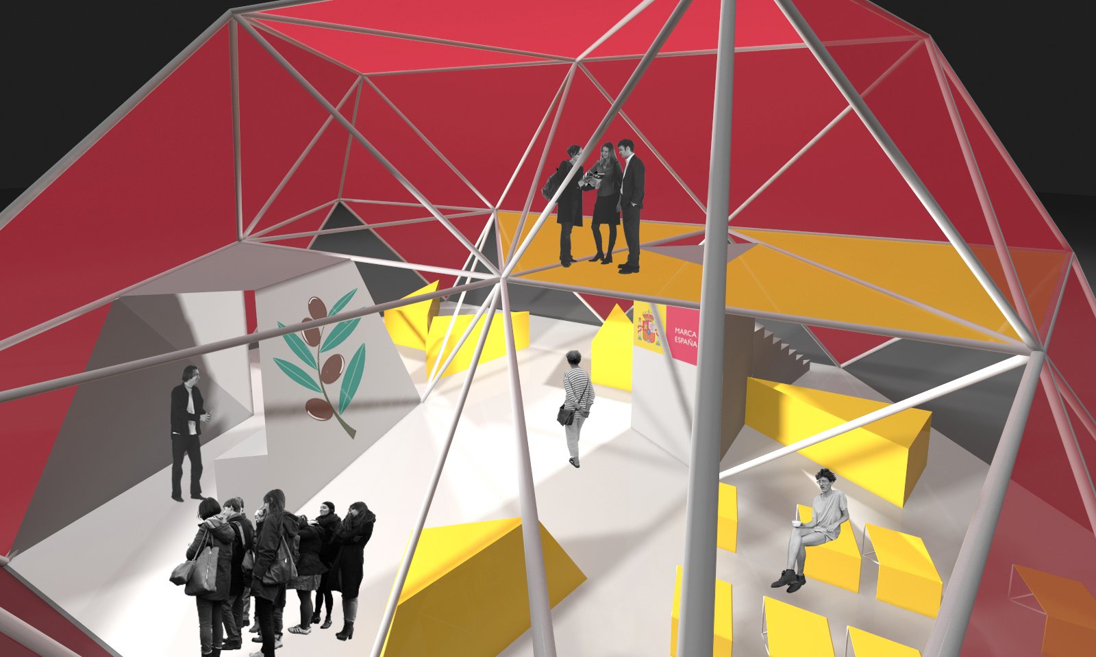 The proposal, known as the unfolded polyhedron, is based on a modular system that allows for different Pavilion configurations to accommodate the requirements of different national and international trade fairs. From a basic module, the different solutions are obtained by addition. The geometry of the basic polyhedron is based on those imagined by Emilio Pérez Piñero for his deployable structures, more specifically those formed by three rods that meet in the middle. The basic polyhedron is built from triangles of side 3.50 m and whose sides are 60º apart, as Buckminster Fuller said nature builds its artifacts using coordinate axes 60º apart from each other, as this arrangement is the one that allows the most efficient energy transactions.
