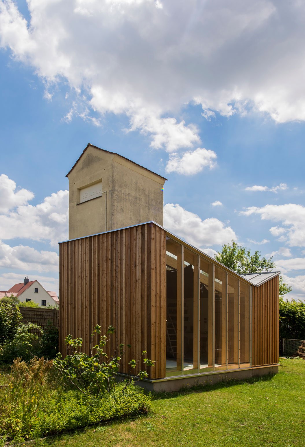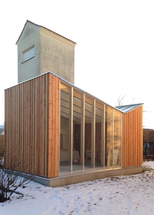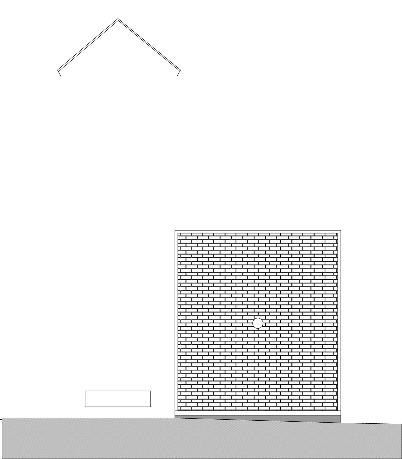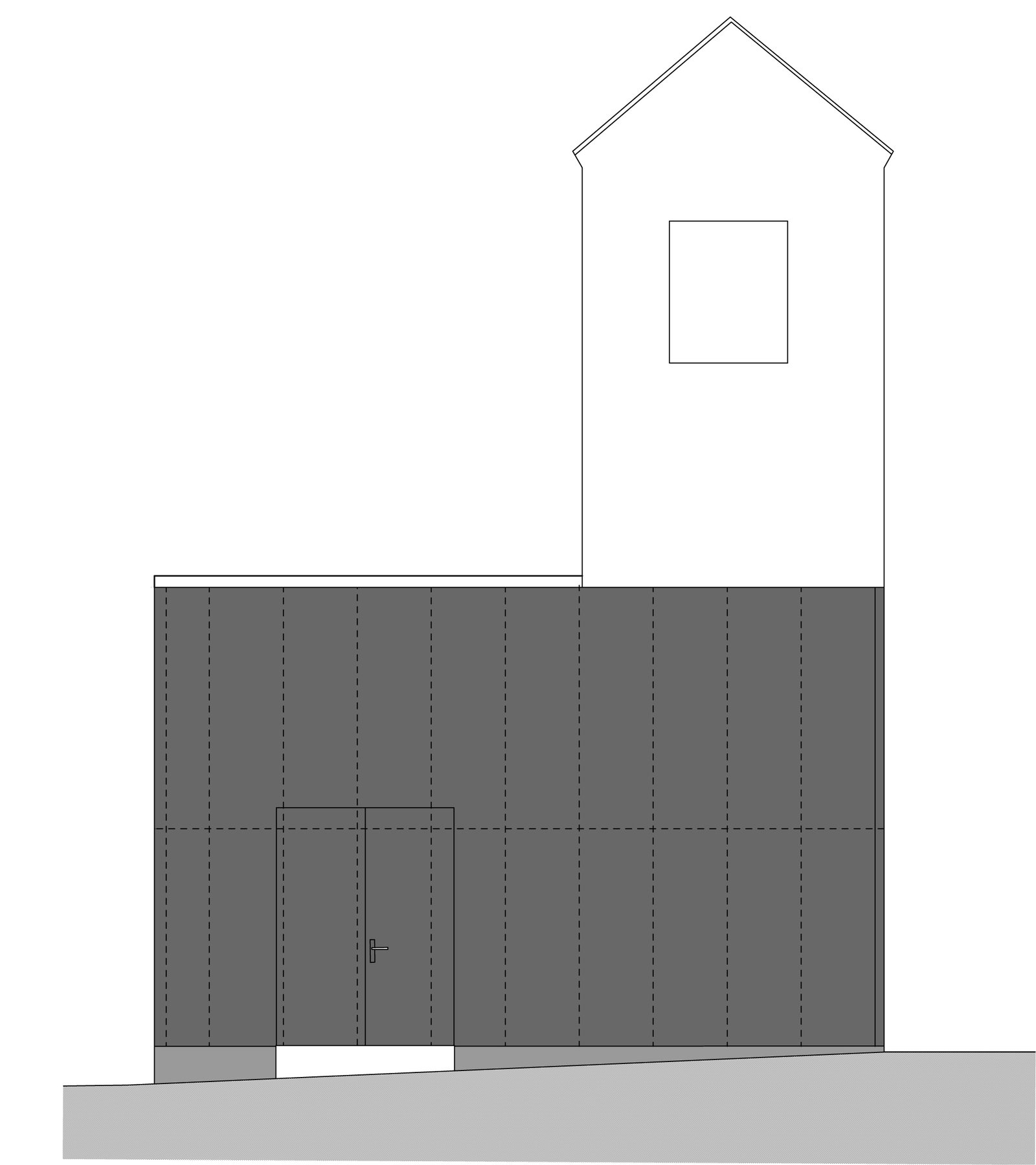 A Photo Studio has been designed in a plot where there is already a house and a power transformer. The owner of the house of a little Town called Weissenburg, in Bayern, would like to have his Atelier in his backyard. The space is opened as a bellows Camera in the direction of the main room, where the photographs should be taken. The studio works as a dark room, and the light could be controlled through curtains. The room is only 20 m2 and it is divided into two parts; a stage with a brick wall where the photograph will be taken and a little laboratory where everything is prepared. The front facade is covered with wood vertical elements, where the light should not come in, and with glass where the light is allowed to come inside of the room. The entire space is conceived as an old bellows camera in the Digital Era.