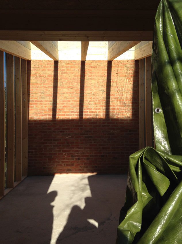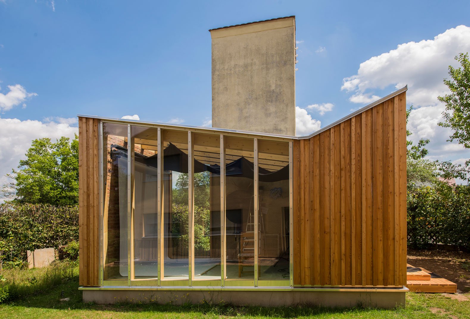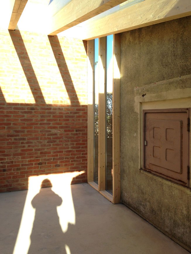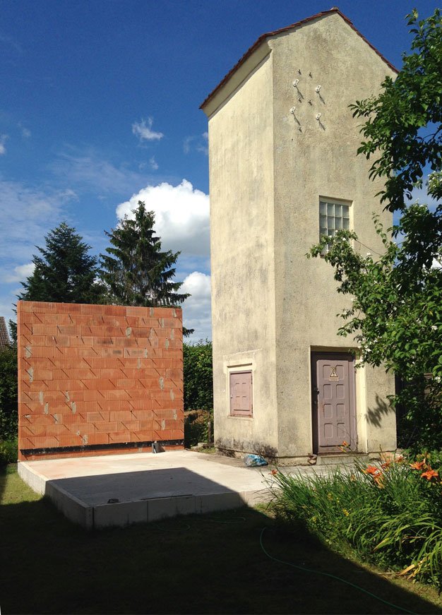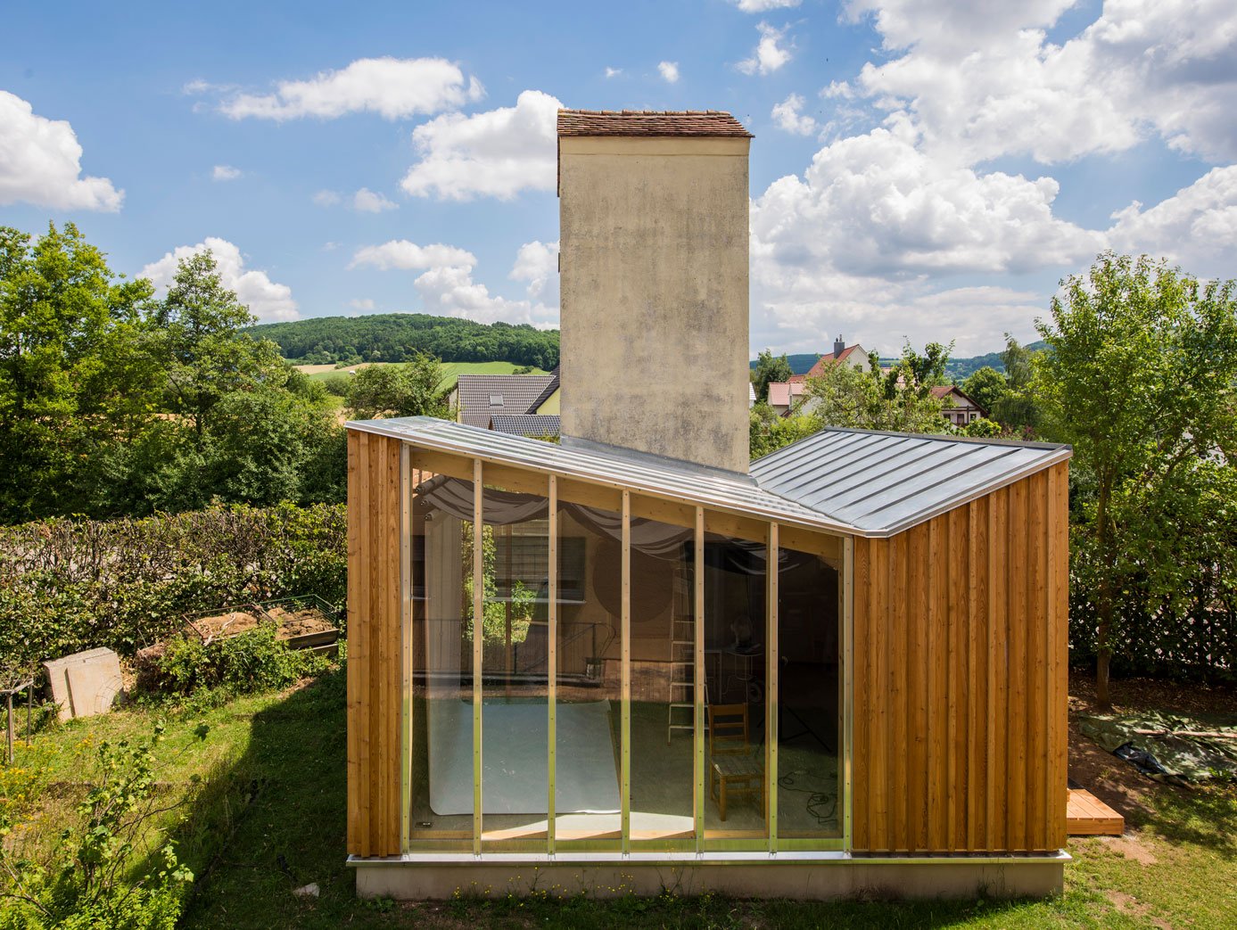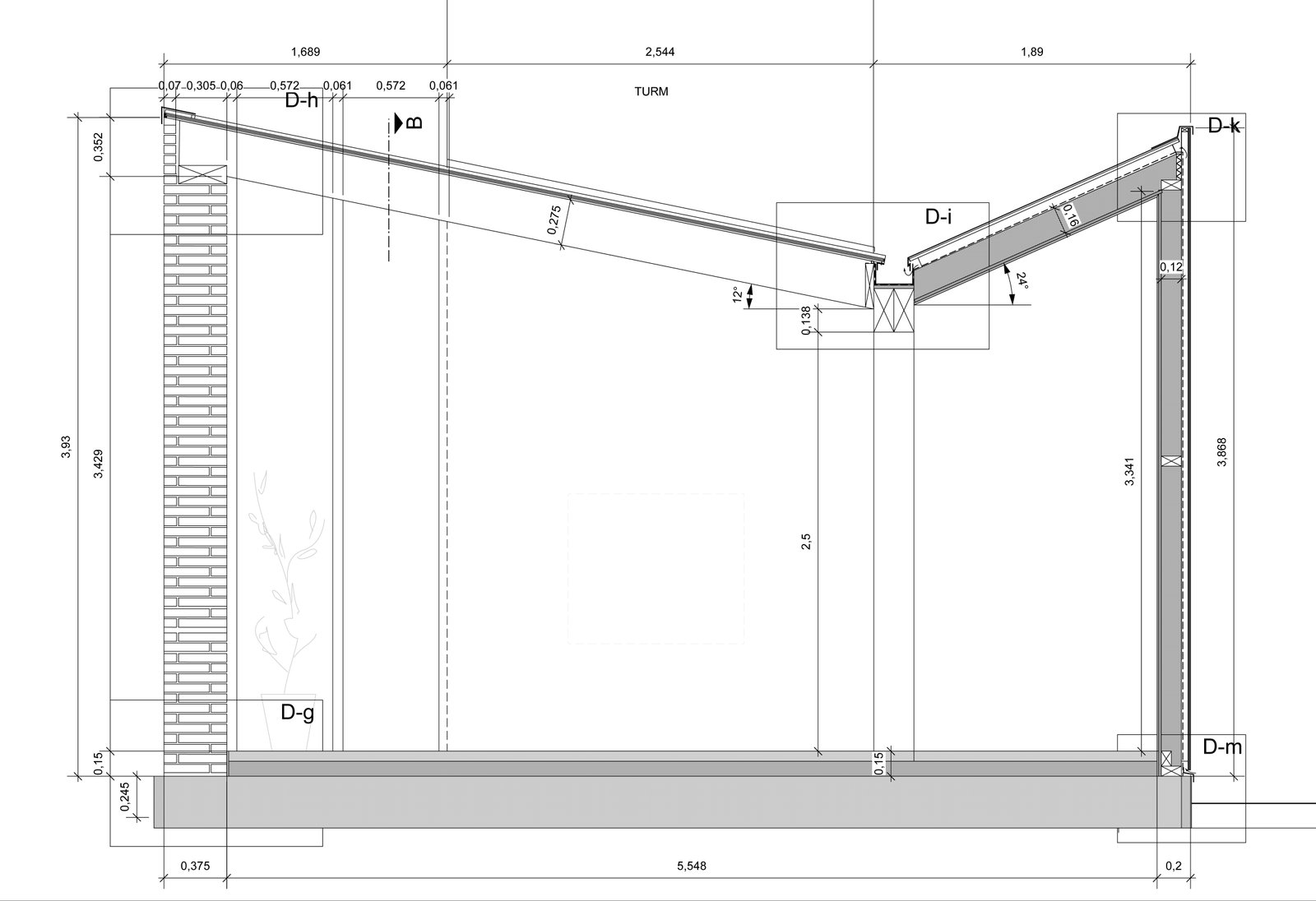 A Photo Studio has been designed in a plot where there is already a house and a power transformer. The owner of the house of a little Town called Weissenburg, in Bayern, would like to have his Atelier in his backyard. The space is opened as a bellows Camera in the direction of the main room, where the photographs should be taken. The studio works as a dark room, and the light could be controlled through curtains. The room is only 20 m2 and it is divided into two parts; a stage with a brick wall where the photograph will be taken and a little laboratory where everything is prepared. The front facade is covered with wood vertical elements, where the light should not come in, and with glass where the light is allowed to come inside of the room. The entire space is conceived as an old bellows camera in the Digital Era.