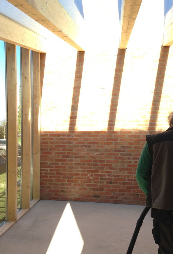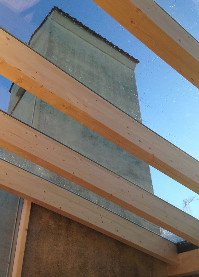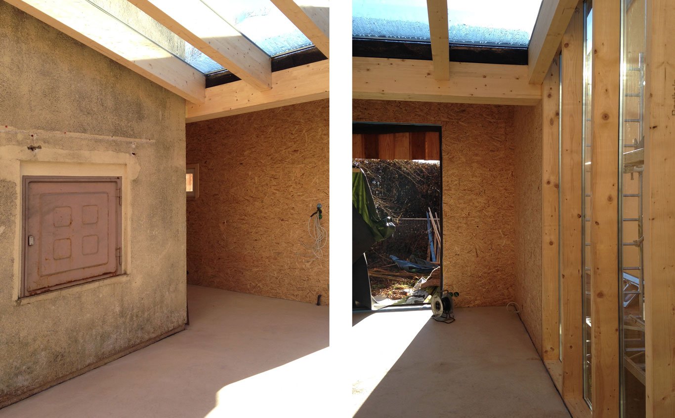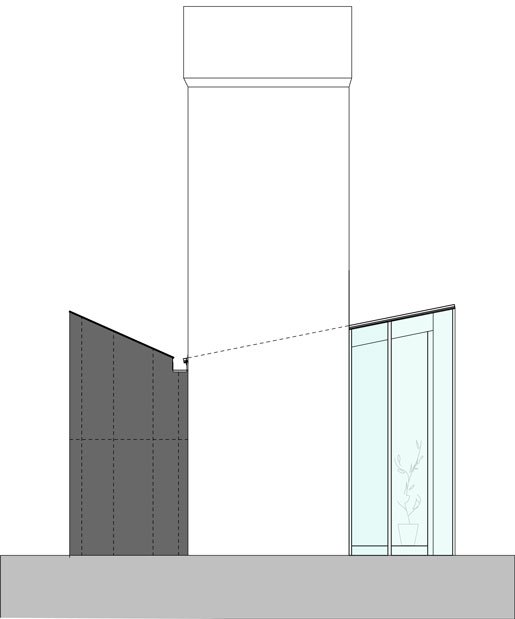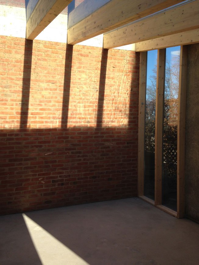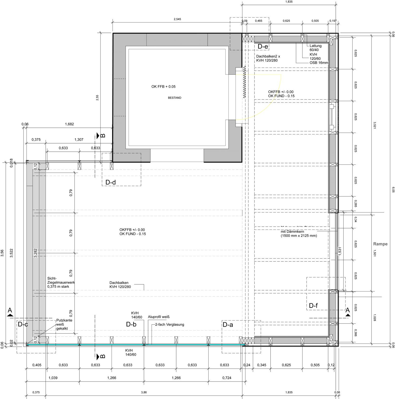 A Photo Studio has been designed in a plot where there is already a house and a power transformer. The owner of the house of a little Town called Weissenburg, in Bayern, would like to have his Atelier in his backyard. The space is opened as a bellows Camera in the direction of the main room, where the photographs should be taken. The studio works as a dark room, and the light could be controlled through curtains. The room is only 20 m2 and it is divided into two parts; a stage with a brick wall where the photograph will be taken and a little laboratory where everything is prepared. The front facade is covered with wood vertical elements, where the light should not come in, and with glass where the light is allowed to come inside of the room. The entire space is conceived as an old bellows camera in the Digital Era.