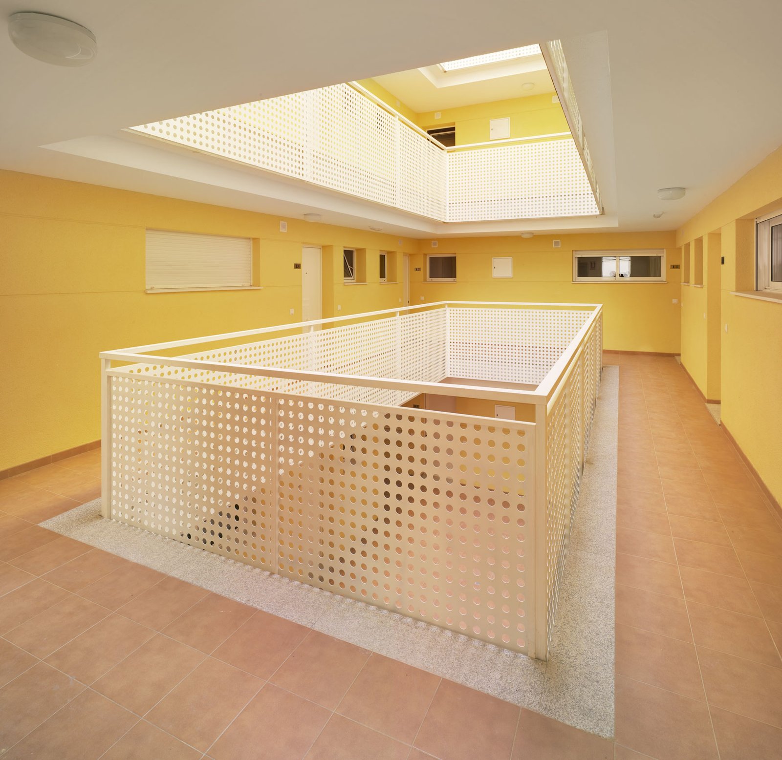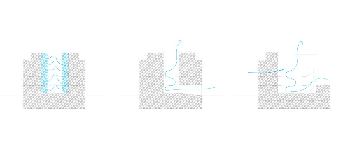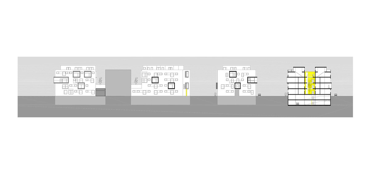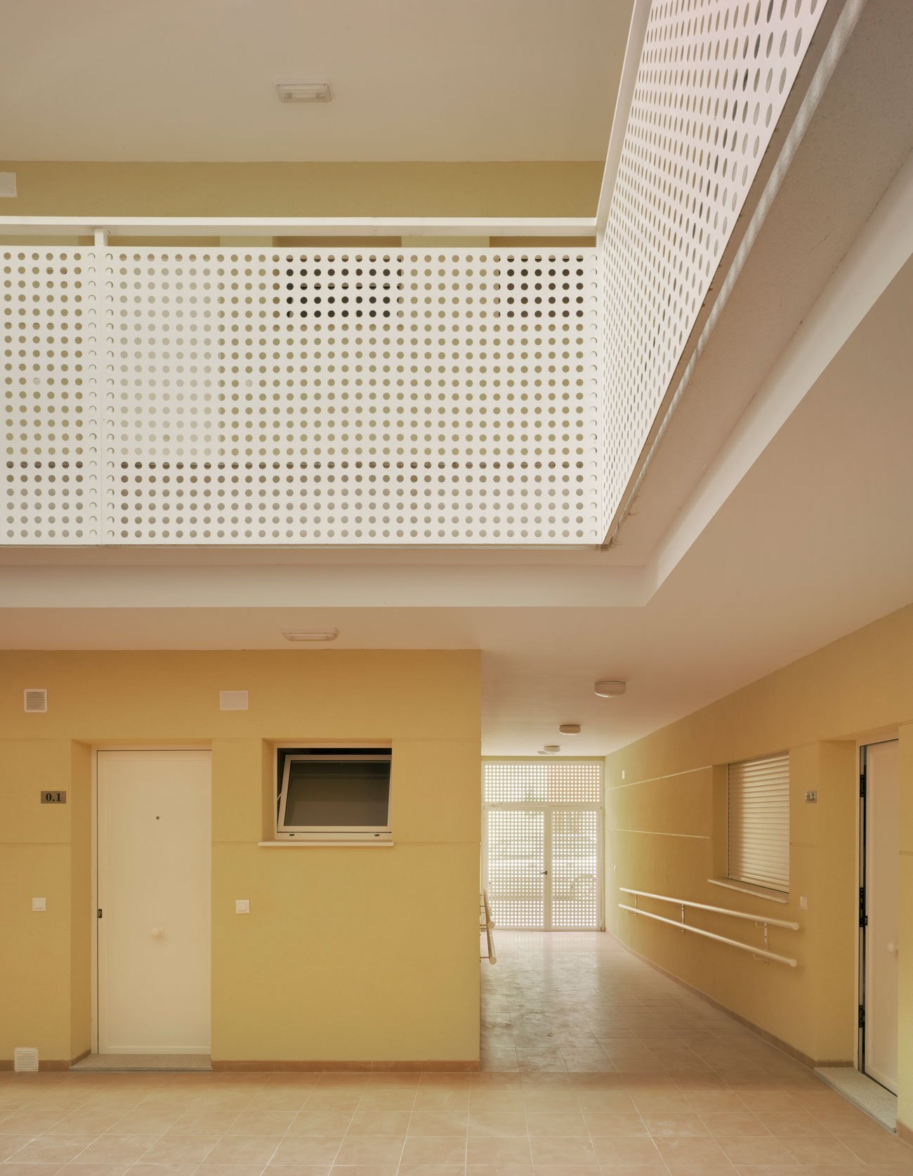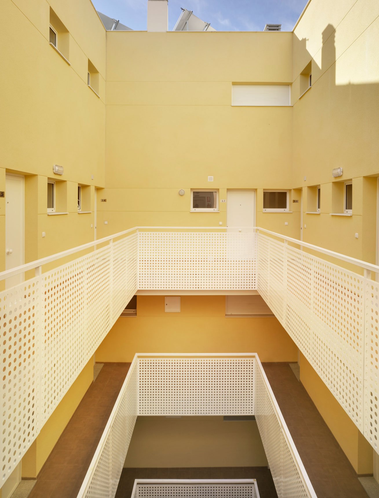 Through a tunnel we enter a patio in the form of a "Corralla", open, ventilated, which resolves the horizontal and vertical communications. At the back are the stairs leading to the exterior corridors that give access to the dwellings. All the dwellings have cross ventilation thanks to the location of the patio. All the wet areas have natural ventilation and lighting thanks to the corrala patio and the cross ventilation it produces. The ground floor dwellings are adapted or convertible. On the 1st and 2nd floors there are 4, 3, 2 and 1 bedroom dwellings, flexible dwellings that allow the possibility of changes according to the needs of each tenant. The apartment interiors are based on functional layouts, with calm, uncluttered spaces that allow the occupants the flexibility to inhabit them in a number of different ways. They are designed to be environmentally efficient, maximizing natural light and ventilation to reduce energy use. In the third level there are houses that are developed in two levels with private green roofs. The semi-basement and basement floors contain storage rooms and parking spaces.