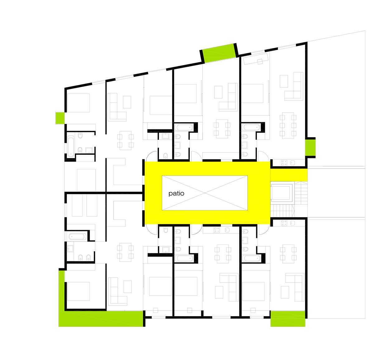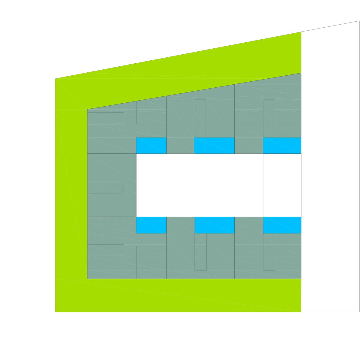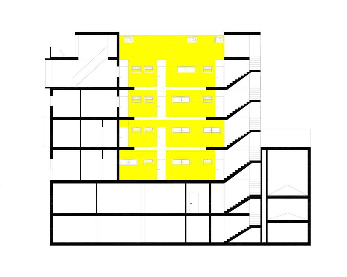 Through a tunnel we enter a patio in the form of a "Corralla", open, ventilated, which resolves the horizontal and vertical communications. At the back are the stairs leading to the exterior corridors that give access to the dwellings. All the dwellings have cross ventilation thanks to the location of the patio. All the wet areas have natural ventilation and lighting thanks to the corrala patio and the cross ventilation it produces. The ground floor dwellings are adapted or convertible. On the 1st and 2nd floors there are 4, 3, 2 and 1 bedroom dwellings, flexible dwellings that allow the possibility of changes according to the needs of each tenant. The apartment interiors are based on functional layouts, with calm, uncluttered spaces that allow the occupants the flexibility to inhabit them in a number of different ways. They are designed to be environmentally efficient, maximizing natural light and ventilation to reduce energy use. In the third level there are houses that are developed in two levels with private green roofs. The semi-basement and basement floors contain storage rooms and parking spaces.