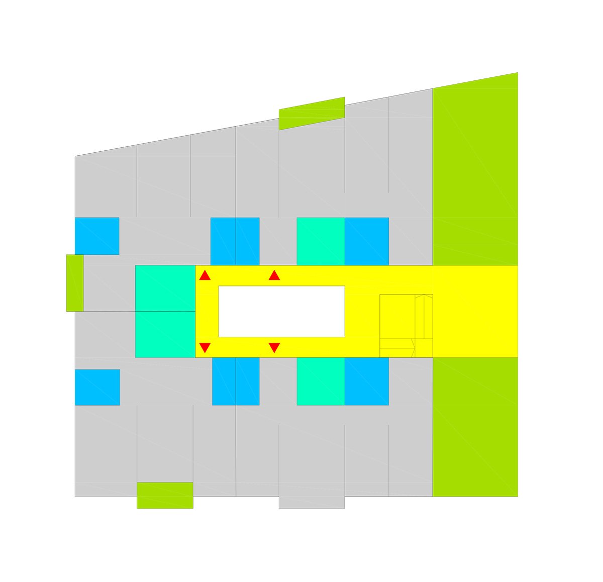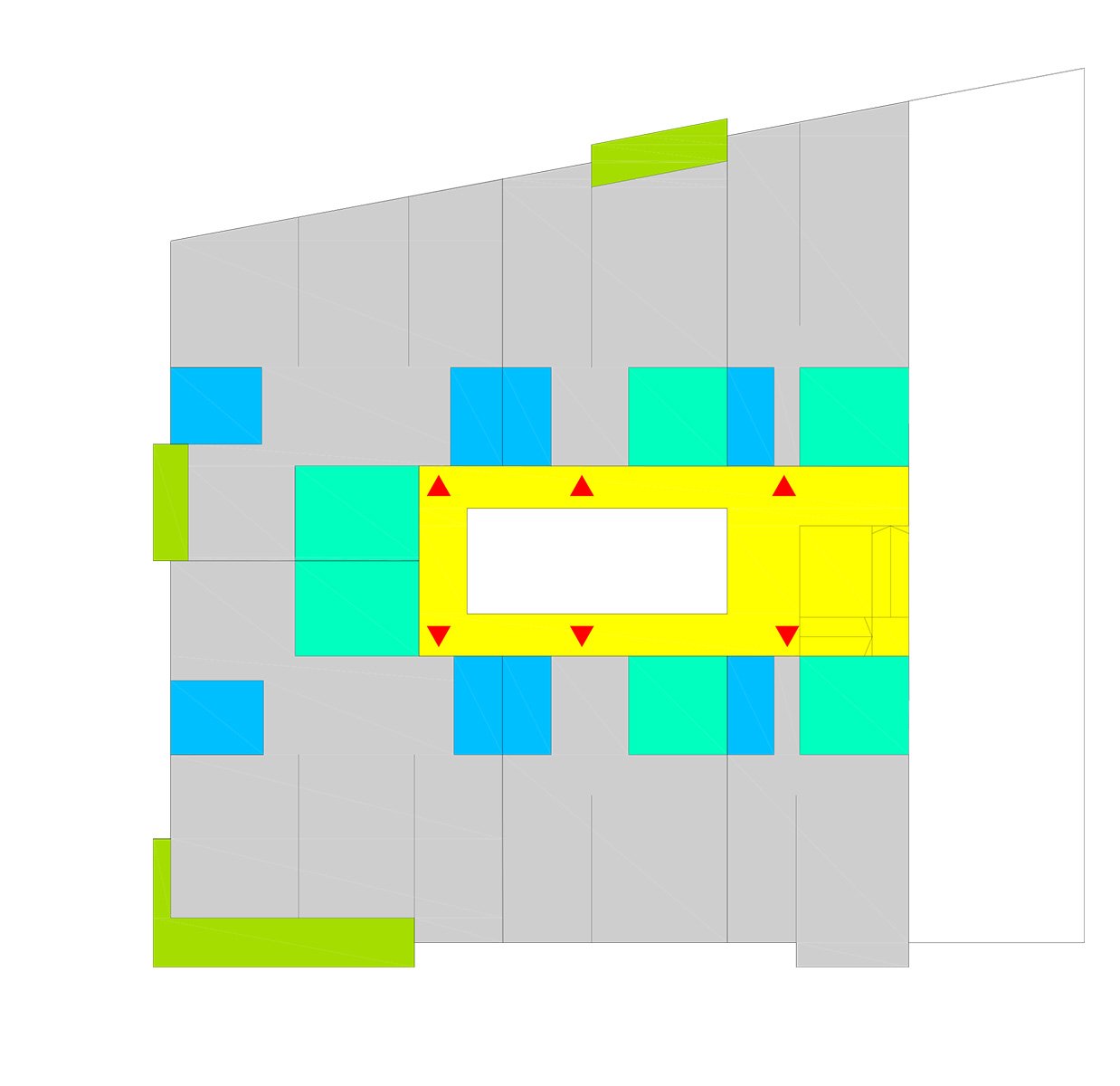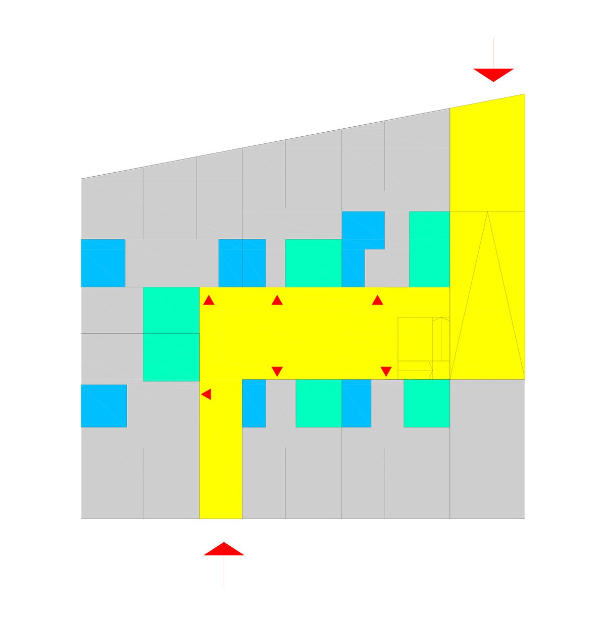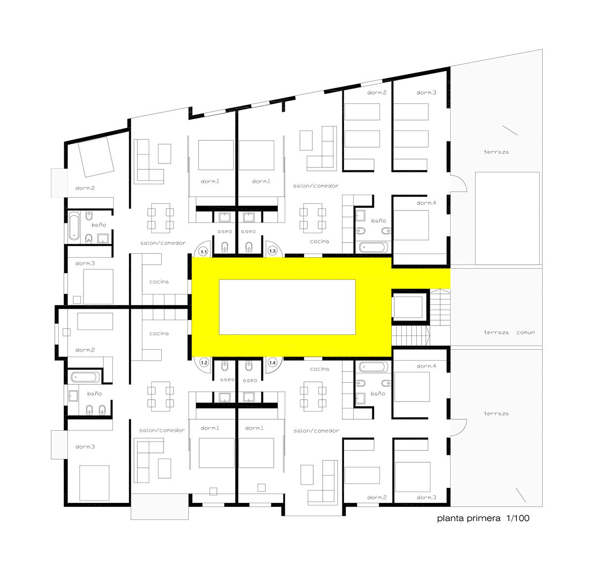 Through a tunnel we enter a patio in the form of a "Corralla", open, ventilated, which resolves the horizontal and vertical communications. At the back are the stairs leading to the exterior corridors that give access to the dwellings. All the dwellings have cross ventilation thanks to the location of the patio. All the wet areas have natural ventilation and lighting thanks to the corrala patio and the cross ventilation it produces. The ground floor dwellings are adapted or convertible. On the 1st and 2nd floors there are 4, 3, 2 and 1 bedroom dwellings, flexible dwellings that allow the possibility of changes according to the needs of each tenant. The apartment interiors are based on functional layouts, with calm, uncluttered spaces that allow the occupants the flexibility to inhabit them in a number of different ways. They are designed to be environmentally efficient, maximizing natural light and ventilation to reduce energy use. In the third level there are houses that are developed in two levels with private green roofs. The semi-basement and basement floors contain storage rooms and parking spaces.
